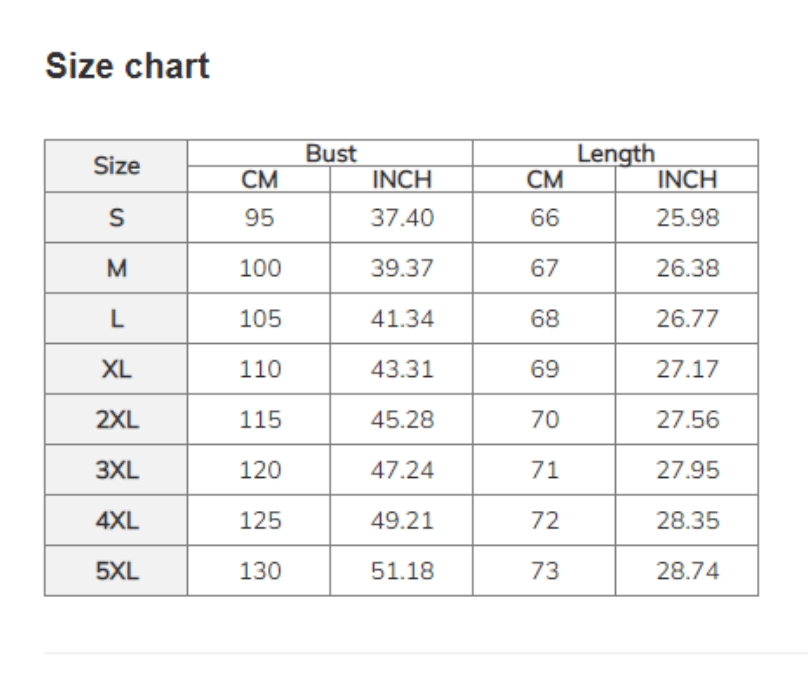 | Size | Bust | Length | ||